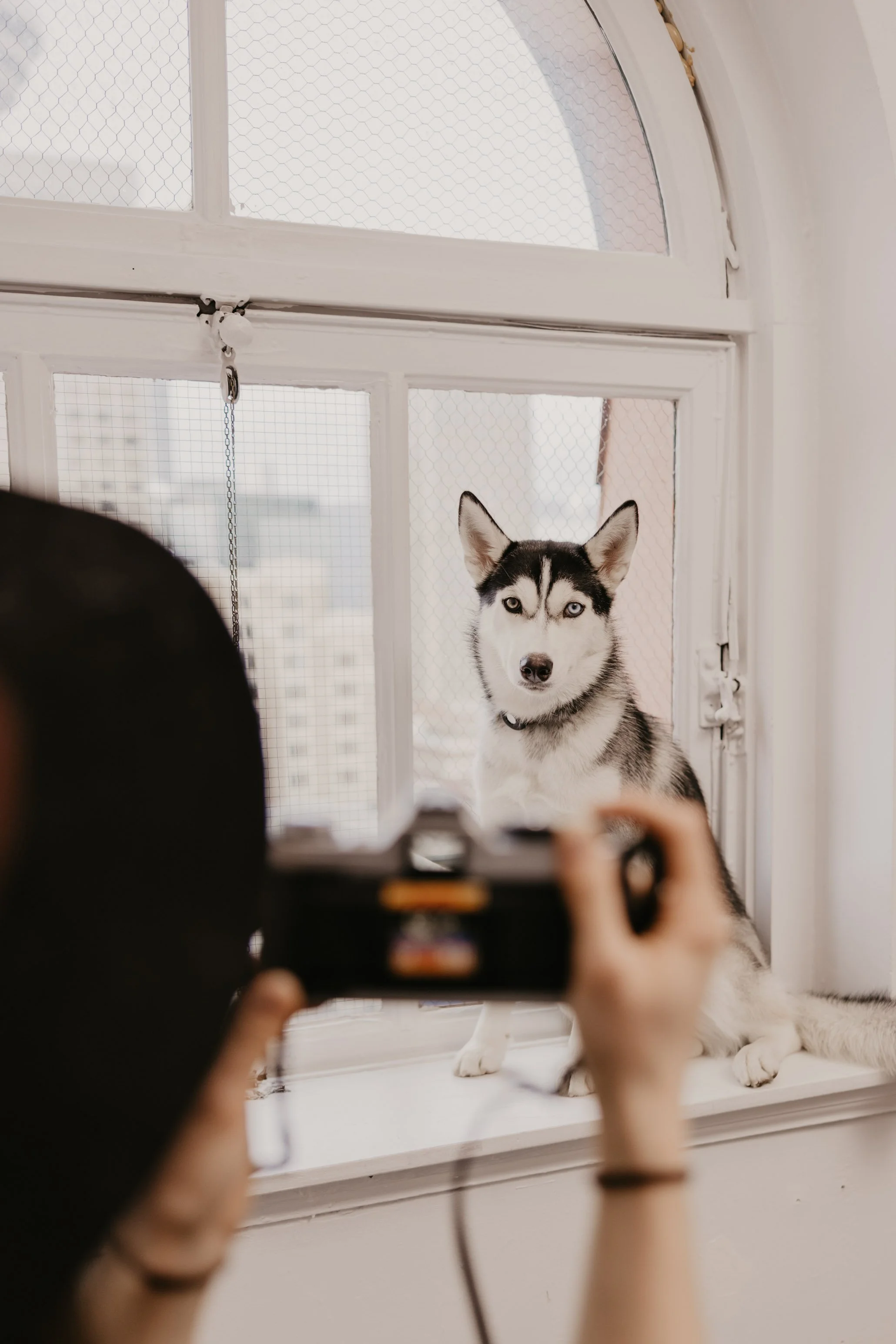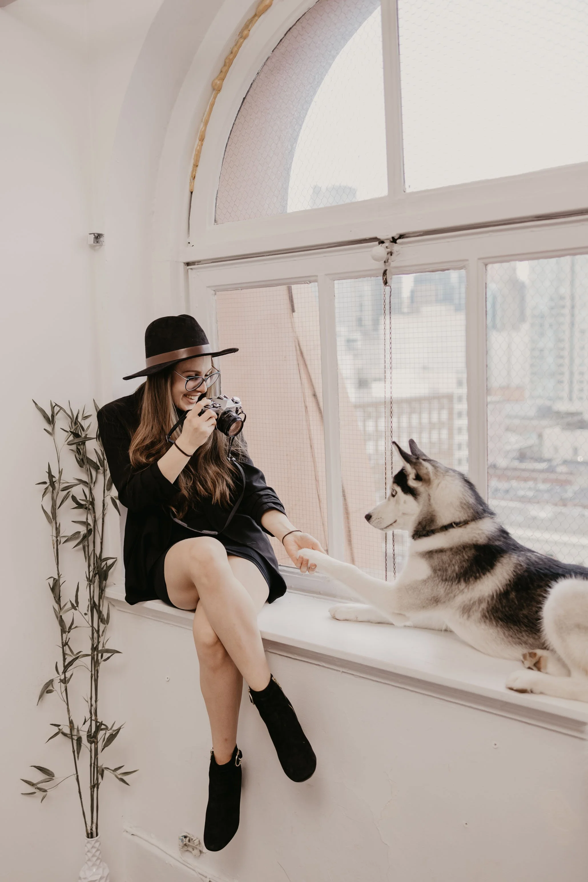 I will warn you, Gaia will likely try to say hi to you during our zoom meeting. One day, we have high hopes for her to become our designated gear guardian - keeping a watchful eye over our equipment during shoots. At the moment, we're fine-tuning her focus skills, especially when those sneaky bunnies make an appearance. Despite the occasional distractions, Gaia has surprised us with her patience at recent shoots and weddings she's attended! Nevertheless, we can't wait for you to meet her. Get ready for a meeting that's equal parts business and cuteness overload!